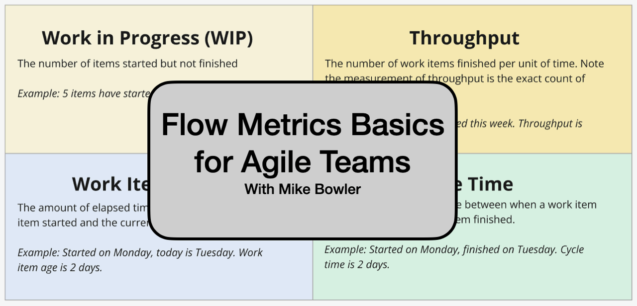 - Understanding basic flow metrics of Cycletime, Throughput, Work In Progress (WIP), and Work Item Age